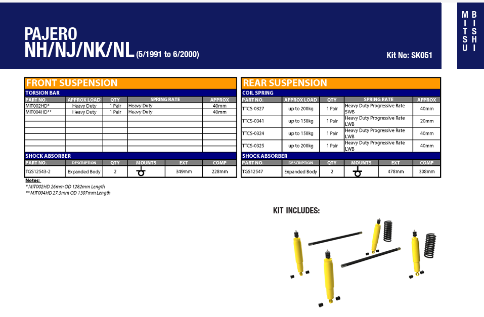 TERRAIN TAMER -KIT DE SUSPENSION REHAUSSE +40/50MM POUR MITSUBISHI PAJERO II 5 PORTES DE 1991 A 1999 2.8 TD V26/V46-1 PARE DE BARRE DE TORSION 1307MM + 4 AMORTISSEURS -2 RESSORTS PROGRESSIFS 200 KG |
