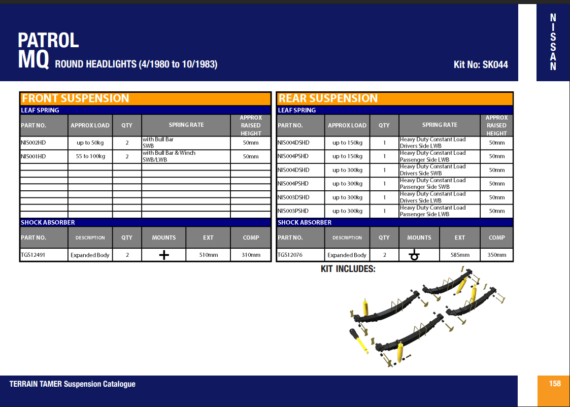 DISPONIBLE SEPTEMBRE-XT AUTOMOTIVE - Kit suspension réhausse +50mm Nissan Patrol 260 2.8 comprend : 2 lames avant médium - 2 lames arrière médium - jeu de bagues - 4 kits brides - 4 amortisseurs Hydrauliques |