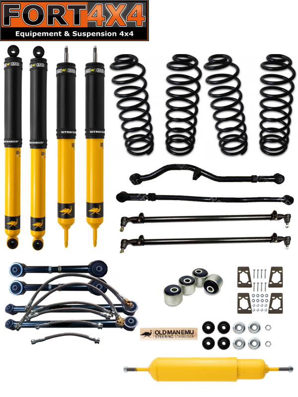 KIT complèt extrême Patrol GR Y60-4 +10cm-4 ressorts - 4 amortisseurs - bras avant et arrière haut/bas HD Raptor 4x4 avec correction et réglables avec articulations - barres panhard réglables avant et arrière |