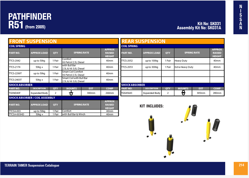 PEDDERS - Kit suspension réhausse +30mm pour Nissan Pathfinder R51 comprend :4 Ressorts renforcés Médium - 4 Amortisseurs Foam Cell - silentblocs triangles correction chasse |