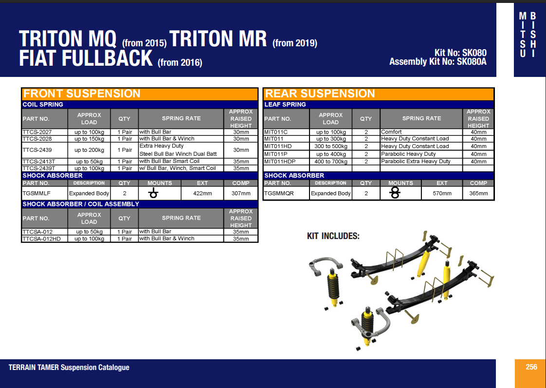 KIT DE SUSPENSION TERRAIN TAMER COMBINÉ ASSEMBLÉ REHAUSSE +40/50MM POUR MITSUBISHI L200 A PARTIR DE 2015 ET FIAT FULLBACK GAMME CONFORT |