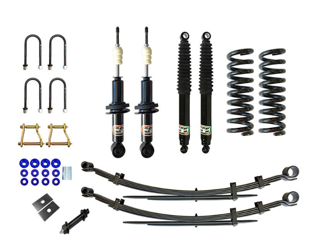 OME - KIT SUSPENSION REHAUSSE +45MM (75KG/MEDIUM) comprend 2 ressorts OME avant (+50kg), 2 lames OME Medium, 2 amortisseurs OME Sport Avant , 2 amortisseurs OME Nitro+ arriere, jumelles, axes, silent blocs, brides de lames |