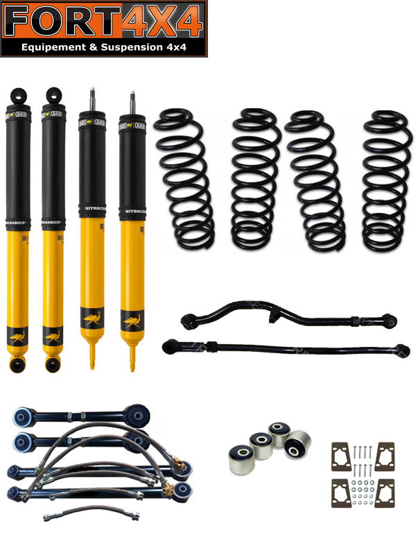KIT complèt extrême Patrol GR Y60-4 +10cm-4 ressorts - 4 amortisseurs - bras avant et arrière haut/bas HD Raptor 4x4 avec correction et réglables avec articulations - barres panhard réglables avant et arrière |