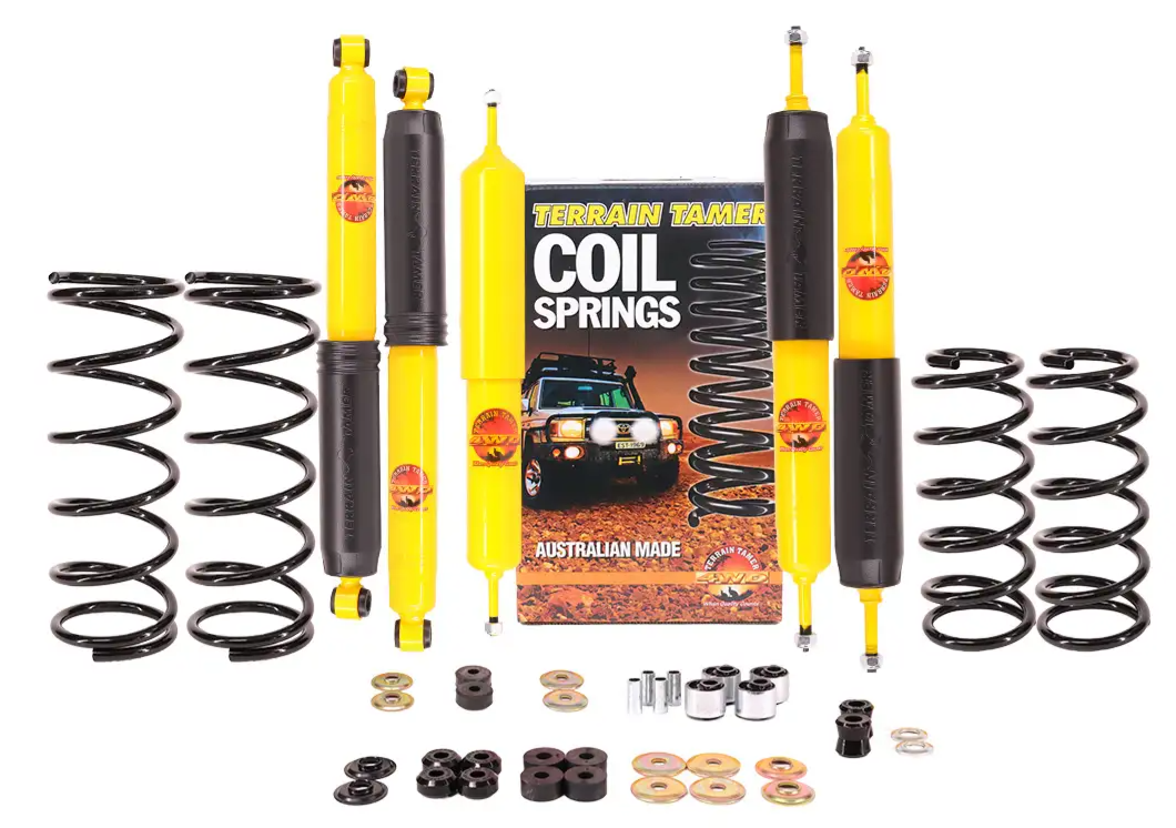 TERRAIN TAMER-KIT SUSPENSION NISSAN PATROL Y 60 5 PORTES +40 MM- 4 AMORTISSEURS + 2 RESSORTS ARRIERE PROGRESSIFS 0 A 300 KG ET 0 A 100 KG AVANT+amortisseur de direction |
